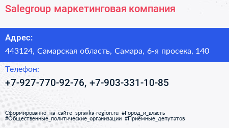 Salegroup, маркетинговая компания по адресу 443124, Самарская область, Самара, 6-я просека, 140 в дальнейшем Организация, размещена в следующих категориях: