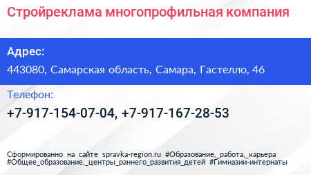Стройреклама, многопрофильная компания по адресу 443080, Самарская область, Самара, Гастелло, 46 в дальнейшем Организация, размещена в следующих категориях: