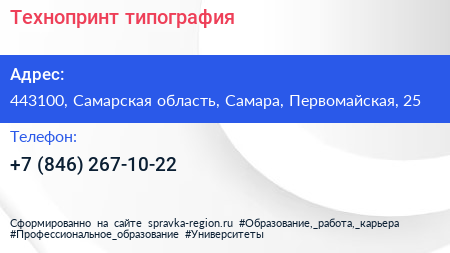 Технопринт, типография по адресу 443100, Самарская область, Самара, Первомайская, 25 в дальнейшем Организация, размещена в следующих категориях: