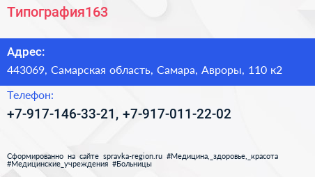 Типография163 по адресу 443069, Самарская область, Самара, Авроры, 110 к2 в дальнейшем Организация, размещена в следующих категориях: