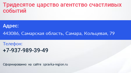 Тридесятое царство, агентство счастливых событий по адресу 443086, Самарская область, Самара, Кольцевая, 79 в дальнейшем Организация, размещена в следующих категориях: