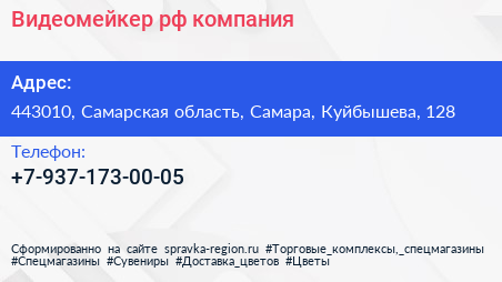 Видеомейкер.рф, компания по адресу 443010, Самарская область, Самара, Куйбышева, 128 в дальнейшем Организация, размещена в следующих категориях: