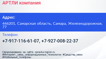 АРТЛИ, компания по адресу 446201, Самарская область, Самара, Железнодорожная, 77 в дальнейшем Организация, размещена в следующих категориях: