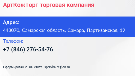 АртКожТорг, торговая компания по адресу 443070, Самарская область, Самара, Партизанская, 19 в дальнейшем Организация, размещена в следующих категориях: