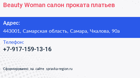 Beauty Woman, салон проката платьев по адресу 443001, Самарская область, Самара, Чкалова, 90а в дальнейшем Организация, размещена в следующих категориях: