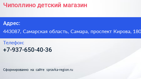 Чиполлино, детский магазин по адресу 443087, Самарская область, Самара, проспект Кирова, 180 в дальнейшем Организация, размещена в следующих категориях:
