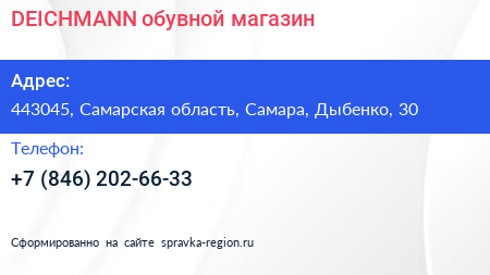 DEICHMANN, обувной магазин по адресу 443045, Самарская область, Самара, Дыбенко, 30 в дальнейшем Организация, размещена в следующих категориях: