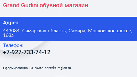 Grand Gudini, обувной магазин по адресу 443084, Самарская область, Самара, Московское шоссе, 163а в дальнейшем Организация, размещена в следующих категориях: