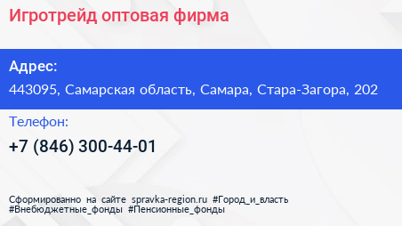 Игротрейд, оптовая фирма по адресу 443095, Самарская область, Самара, Стара-Загора, 202 в дальнейшем Организация, размещена в следующих категориях: