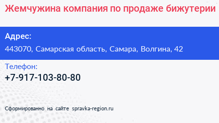 Жемчужина, компания по продаже бижутерии по адресу 443070, Самарская область, Самара, Волгина, 42 в дальнейшем Организация, размещена в следующих категориях: