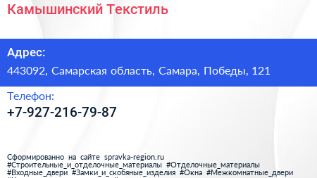 Камышинский Текстиль по адресу 443092, Самарская область, Самара, Победы, 121 в дальнейшем Организация, размещена в следующих категориях: