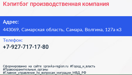 Кэпитбэг, производственная компания по адресу 443069, Самарская область, Самара, Волгина, 127а к3 в дальнейшем Организация, размещена в следующих категориях: