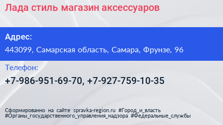 Лада стиль, магазин аксессуаров по адресу 443099, Самарская область, Самара, Фрунзе, 96 в дальнейшем Организация, размещена в следующих категориях: