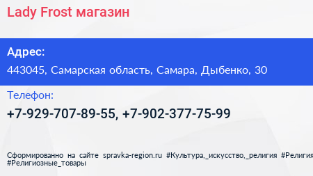 Lady Frost, магазин по адресу 443045, Самарская область, Самара, Дыбенко, 30 в дальнейшем Организация, размещена в следующих категориях: