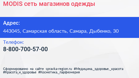 MODIS, сеть магазинов одежды по адресу 443045, Самарская область, Самара, Дыбенко, 30 в дальнейшем Организация, размещена в следующих категориях: