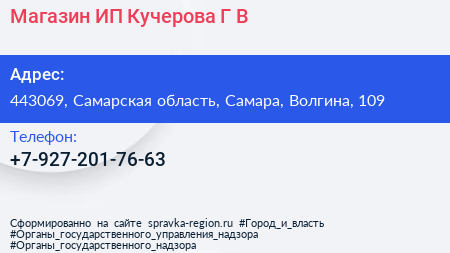 Магазин, ИП Кучерова Г.В. по адресу 443069, Самарская область, Самара, Волгина, 109 в дальнейшем Организация, размещена в следующих категориях: