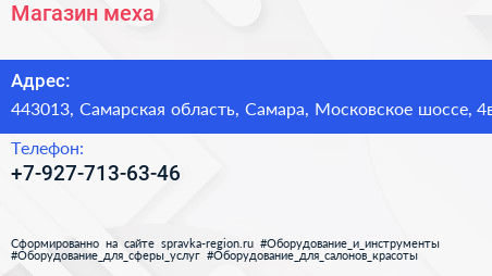 Магазин меха по адресу 443013, Самарская область, Самара, Московское шоссе, 4в в дальнейшем Организация, размещена в следующих категориях: