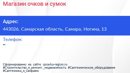 Магазин очков и сумок по адресу 443026, Самарская область, Самара, Ногина, 13 в дальнейшем Организация, размещена в следующих категориях: