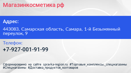 Магазинкосметика.рф по адресу 443083, Самарская область, Самара, 1-й Безымянный переулок, 9 в дальнейшем Организация, размещена в следующих категориях: