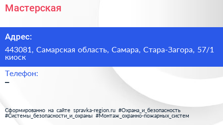 Мастерская по адресу 443081, Самарская область, Самара, Стара-Загора, 57/1 киоск в дальнейшем Организация, размещена в следующих категориях: