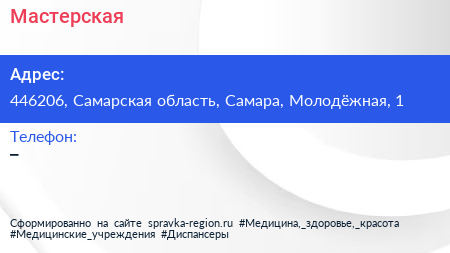 Мастерская по адресу 446206, Самарская область, Самара, Молодёжная, 1 в дальнейшем Организация, размещена в следующих категориях:
