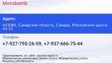 Mensbomb по адресу 443080, Самарская область, Самара, Московское шоссе, 43-55 в дальнейшем Организация, размещена в следующих категориях: