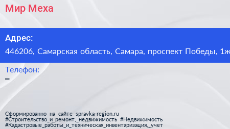 Мир Меха по адресу 446206, Самарская область, Самара, проспект Победы, 1ж в дальнейшем Организация, размещена в следующих категориях: