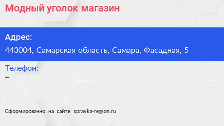 Модный уголок, магазин по адресу 443004, Самарская область, Самара, Фасадная, 5 в дальнейшем Организация, размещена в следующих категориях: