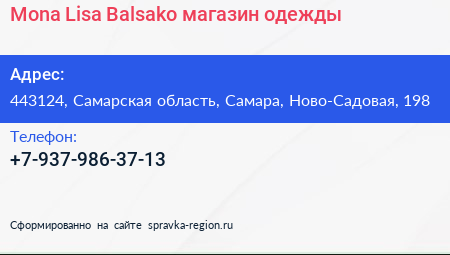 Mona Lisa-Balsako, магазин одежды по адресу 443124, Самарская область, Самара, Ново-Садовая, 198 в дальнейшем Организация, размещена в следующих категориях: