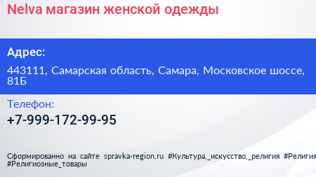 Nelva, магазин женской одежды по адресу 443111, Самарская область, Самара, Московское шоссе, 81Б в дальнейшем Организация, размещена в следующих категориях: