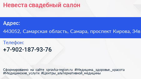 Невеста, свадебный салон по адресу 443052, Самарская область, Самара, проспект Кирова, 34в в дальнейшем Организация, размещена в следующих категориях: