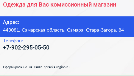 Одежда для Вас, комиссионный магазин по адресу 443081, Самарская область, Самара, Стара-Загора, 84 в дальнейшем Организация, размещена в следующих категориях: