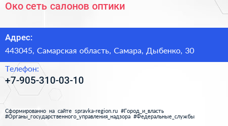 Око, сеть салонов оптики по адресу 443045, Самарская область, Самара, Дыбенко, 30 в дальнейшем Организация, размещена в следующих категориях: