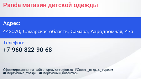 Panda, магазин детской одежды по адресу 443070, Самарская область, Самара, Аэродромная, 47а в дальнейшем Организация, размещена в следующих категориях:
