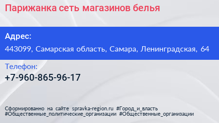 Парижанка, сеть магазинов белья по адресу 443099, Самарская область, Самара, Ленинградская, 64 в дальнейшем Организация, размещена в следующих категориях: