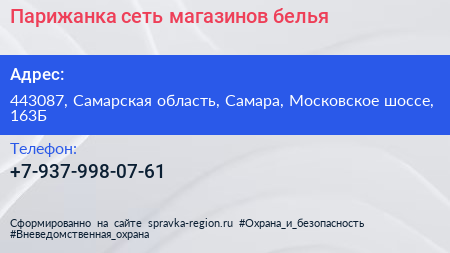 Парижанка, сеть магазинов белья по адресу 443087, Самарская область, Самара, Московское шоссе, 163Б в дальнейшем Организация, размещена в следующих категориях: