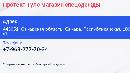 Протект Тулс, магазин спецодежды по адресу 443051, Самарская область, Самара, Республиканская, 106 к1 в дальнейшем Организация, размещена в следующих категориях: