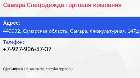 Самара-Спецодежда, торговая компания по адресу 443092, Самарская область, Самара, Физкультурная, 147д в дальнейшем Организация, размещена в следующих категориях: