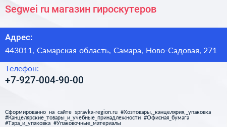 Segwei.ru, магазин гироскутеров по адресу 443011, Самарская область, Самара, Ново-Садовая, 271 в дальнейшем Организация, размещена в следующих категориях: