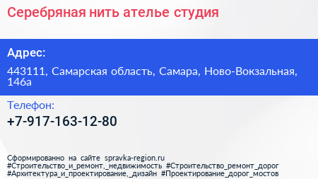 Серебряная нить, ателье-cтудия по адресу 443111, Самарская область, Самара, Ново-Вокзальная, 146а в дальнейшем Организация, размещена в следующих категориях: