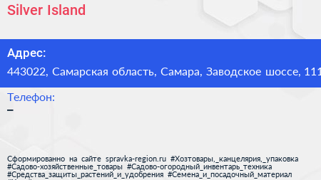 Silver Island по адресу 443022, Самарская область, Самара, Заводское шоссе, 111 в дальнейшем Организация, размещена в следующих категориях:
