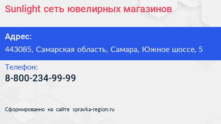 Sunlight, сеть ювелирных магазинов по адресу 443085, Самарская область, Самара, Южное шоссе, 5 в дальнейшем Организация, размещена в следующих категориях: