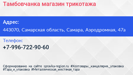 Тамбовчанка, магазин трикотажа по адресу 443070, Самарская область, Самара, Аэродромная, 47а в дальнейшем Организация, размещена в следующих категориях: