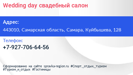 Wedding day, свадебный салон по адресу 443010, Самарская область, Самара, Куйбышева, 128 в дальнейшем Организация, размещена в следующих категориях: