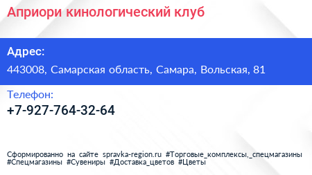 Априори, кинологический клуб по адресу 443008, Самарская область, Самара, Вольская, 81 в дальнейшем Организация, размещена в следующих категориях: