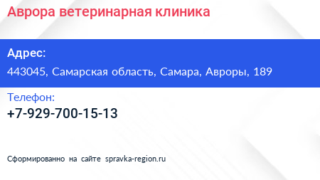 Аврора, ветеринарная клиника по адресу 443045, Самарская область, Самара, Авроры, 189 в дальнейшем Организация, размещена в следующих категориях: