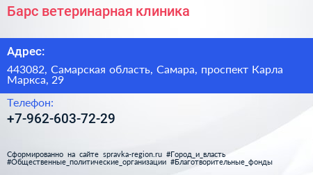 Барс, ветеринарная клиника по адресу 443082, Самарская область, Самара, проспект Карла Маркса, 29 в дальнейшем Организация, размещена в следующих категориях:
