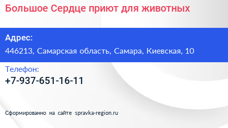 Большое Сердце, приют для животных по адресу 446213, Самарская область, Самара, Киевская, 10 в дальнейшем Организация, размещена в следующих категориях:
