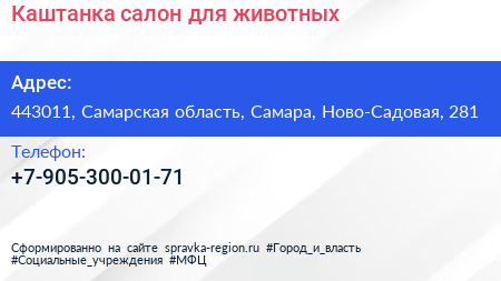 Каштанка, салон для животных по адресу 443011, Самарская область, Самара, Ново-Садовая, 281 в дальнейшем Организация, размещена в следующих категориях: