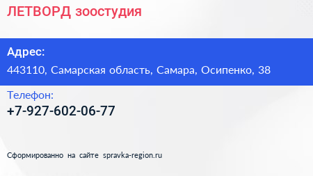 ЛЕТВОРД, зоостудия по адресу 443110, Самарская область, Самара, Осипенко, 38 в дальнейшем Организация, размещена в следующих категориях: